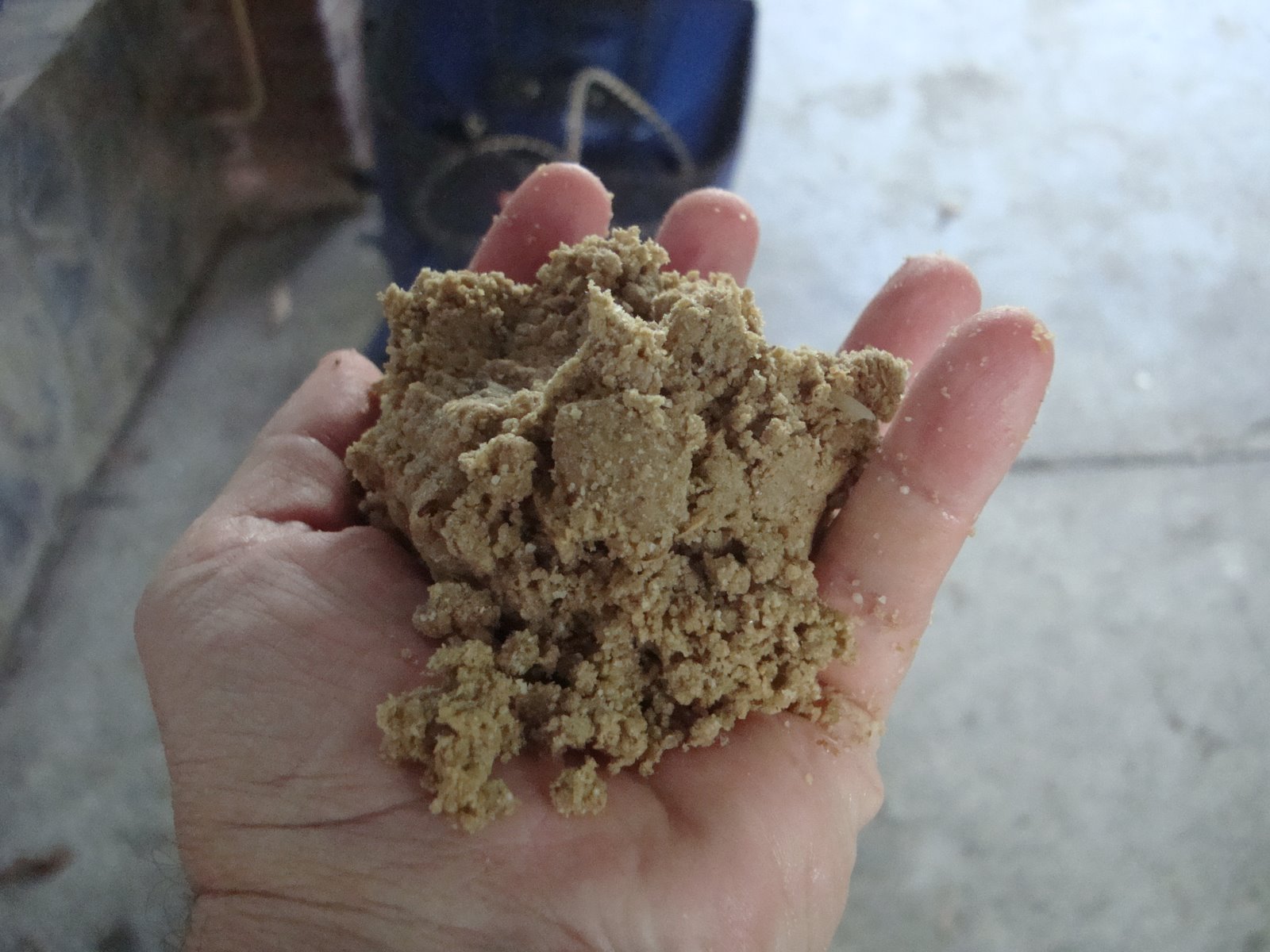 4. add liquid slowly and mix vigourously till all liquid is added and all bran material is dampened. Bokashi mix should be equally damp and slightly sticks to itself.