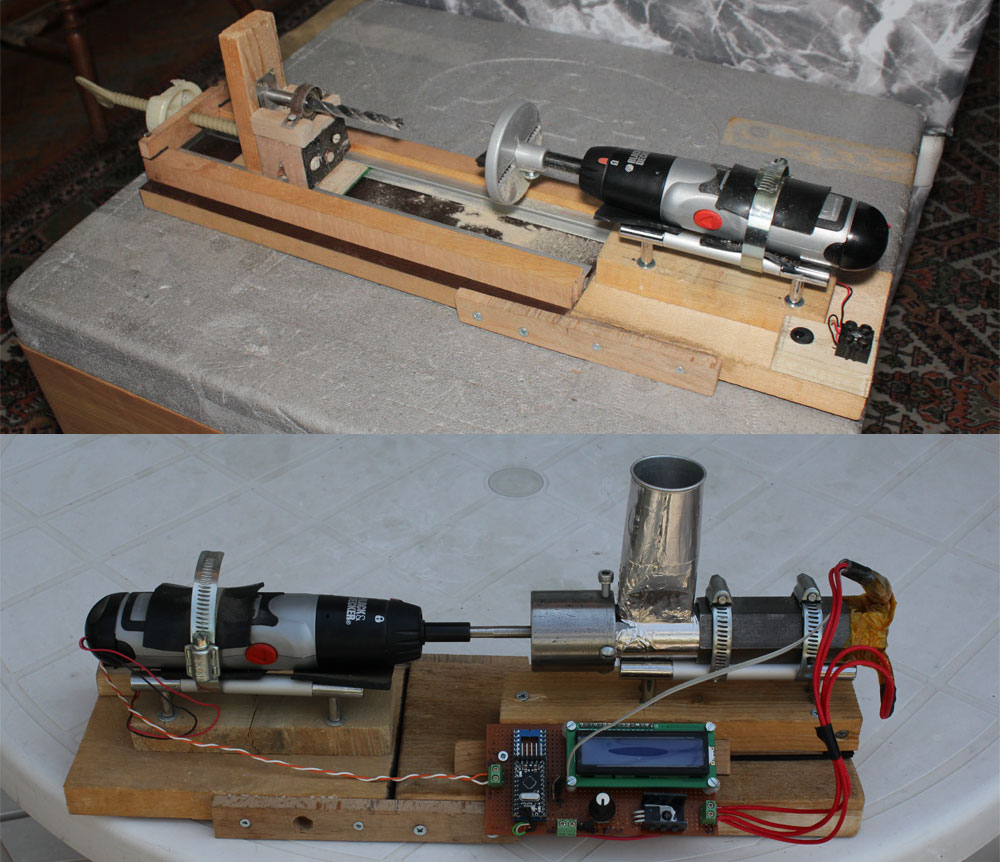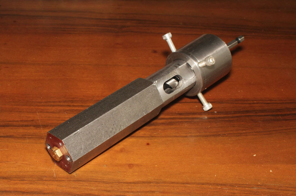 - My metal body assembly came from milling... Seems that my friend did a good job on this part, with adjustable back cover holding 2 roller bearings and replaceable driver screw. 2 different screw bits with 2 sizes, mounting holes in front for the heater elements and replaceable front end. I am planning to mount this unit to my wood lathe which I made some time ago. I will replace the idler part of the lathe to drive the filastruder. The batteries of this low rpm screwdriver was dead long ago and I recycled it as a high torque wood lathe driver working with a 6v 2amp power source... So my good old wood lathe will be a multi-functional tool from now on...