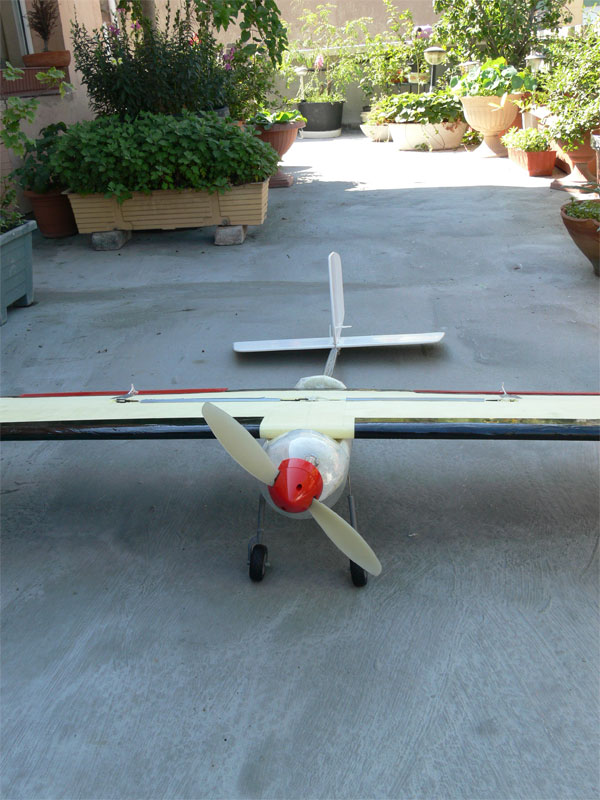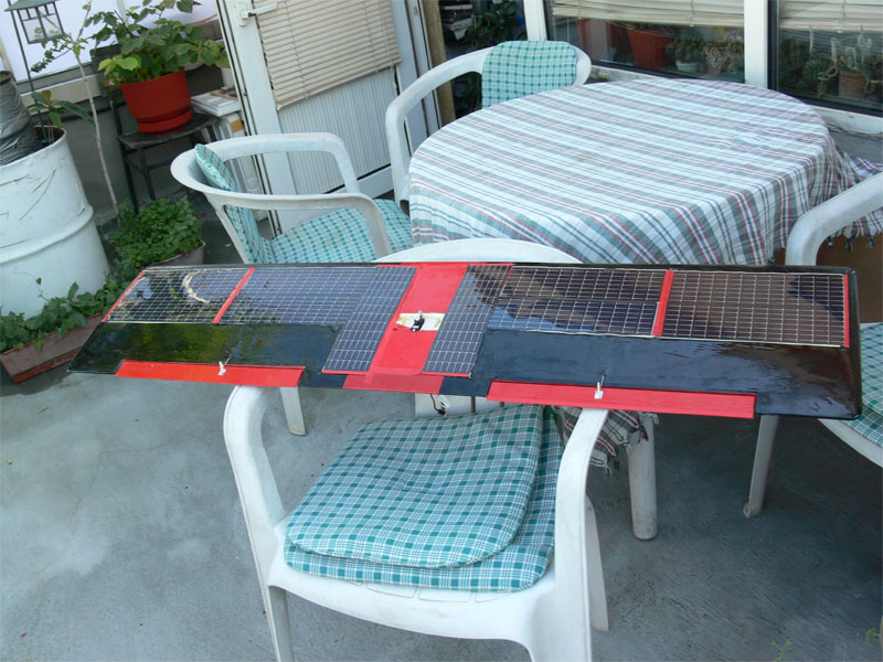 July 2008: Prototype mainframe construction is nearly complete... The equipment: Swan 8 channel RC system (5 of it will be used: rudder, elevator, throttle, ailerons and gear switch for enabling autopilot). 7cell 1100 mah 8,4v nimh battery ( i am planning to add a thermistor or mini thermostat to protect the battery from overcharging by 1,25 amp solar panels on long duration flights). single 9gm servo embedded to the wing to control both ailerons which will be controlled by the autopilot for flight stabilization. two 17gm servos controlling the rudder and the elevator via carbon rods which act inside two pipes extending all the way to tail on the bone stick. 115watt brushless in-runner motor with cooler is controlled by art-tech 18amp esc. ( i have a spare 240w outrunner brushless motor and a 50amp esc in case this motor proves to be insufficient). a 11x5 propeller rotated by a 60mm spinner.
